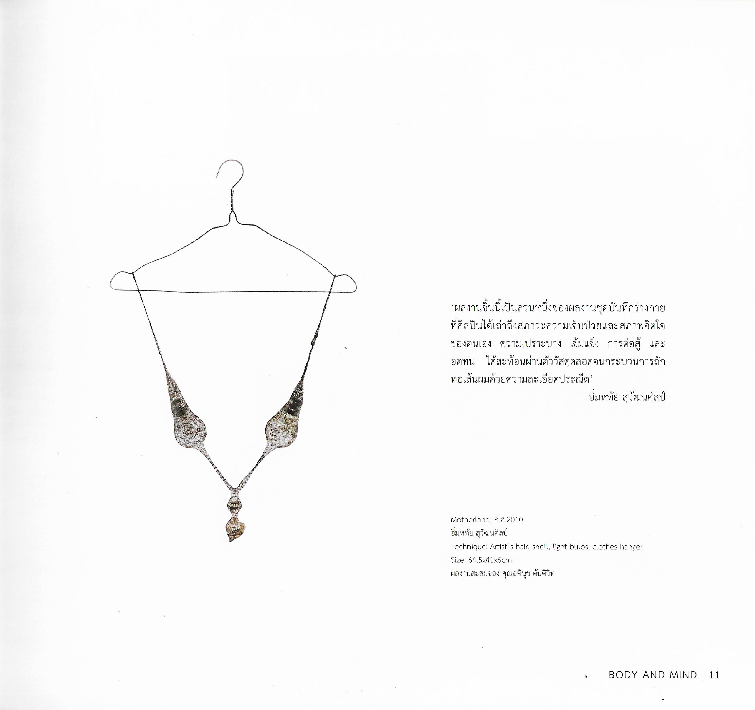 Human bodies are used to emphasise certain ideologies, identities and narratives. Chalood Nimsamer used the female body to portray women’s roles and societal expectations. While other female artists use female body parts for self-expression and documentation, such as work by Pinaree Sanpitak, symbolising nature and nurture, and by Imhathai Suwatthanasilp, exploring her role, mental and physical conditions. Nuriya Waji presents an image of Muslim women against a backdrop of conflicts in the South. We find a painting of a nude male facing the rainbow in work by Chuang Moolpinit. Kawita Vatanajyankur uses her own body to reflect on social problems. The body can be a source of suffering. Influenced by Buddhism and facing his mother’s illness, Chatmongkol Insawang‘s work presents the body as an outer shell for the soul. Ittipol Tangchalok, who is suffering from Parkin- son’s, created mixed media on x-ray films.